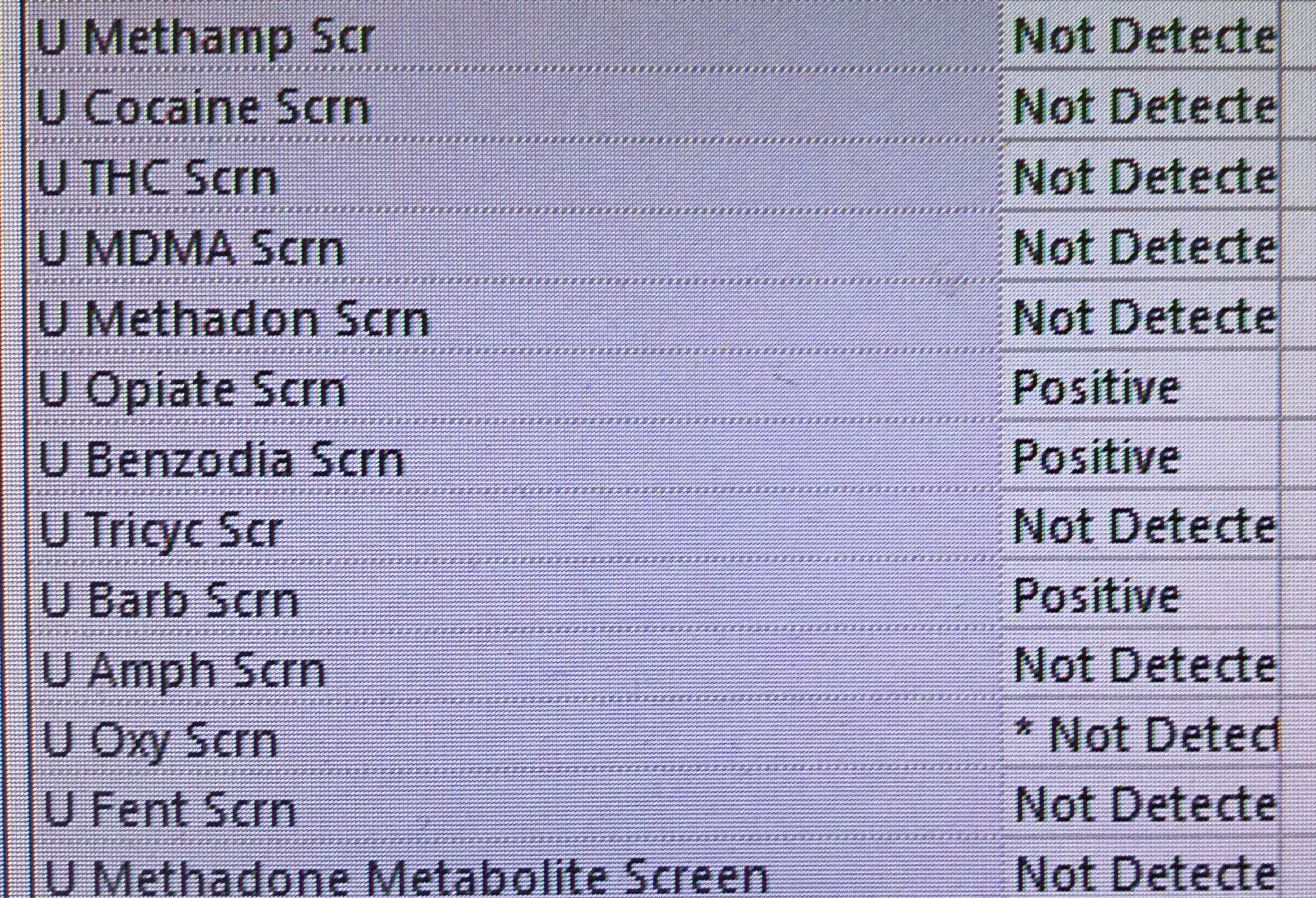 The second example shows a urine drug screen labs results without a 'reference range', being displayed in the same style as 'normal' bloodwork.
