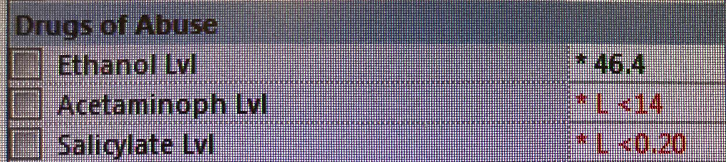 This example also shows the importance of properly coding reference ranges. Acetaminophen and Salicylate levels are low because they are undetectable. This is 'normal'. Here, the computer has flagged this as an 'abnormal' result, because it thinks the value is 'low'. This is a case of incomplete coding of the lab system.